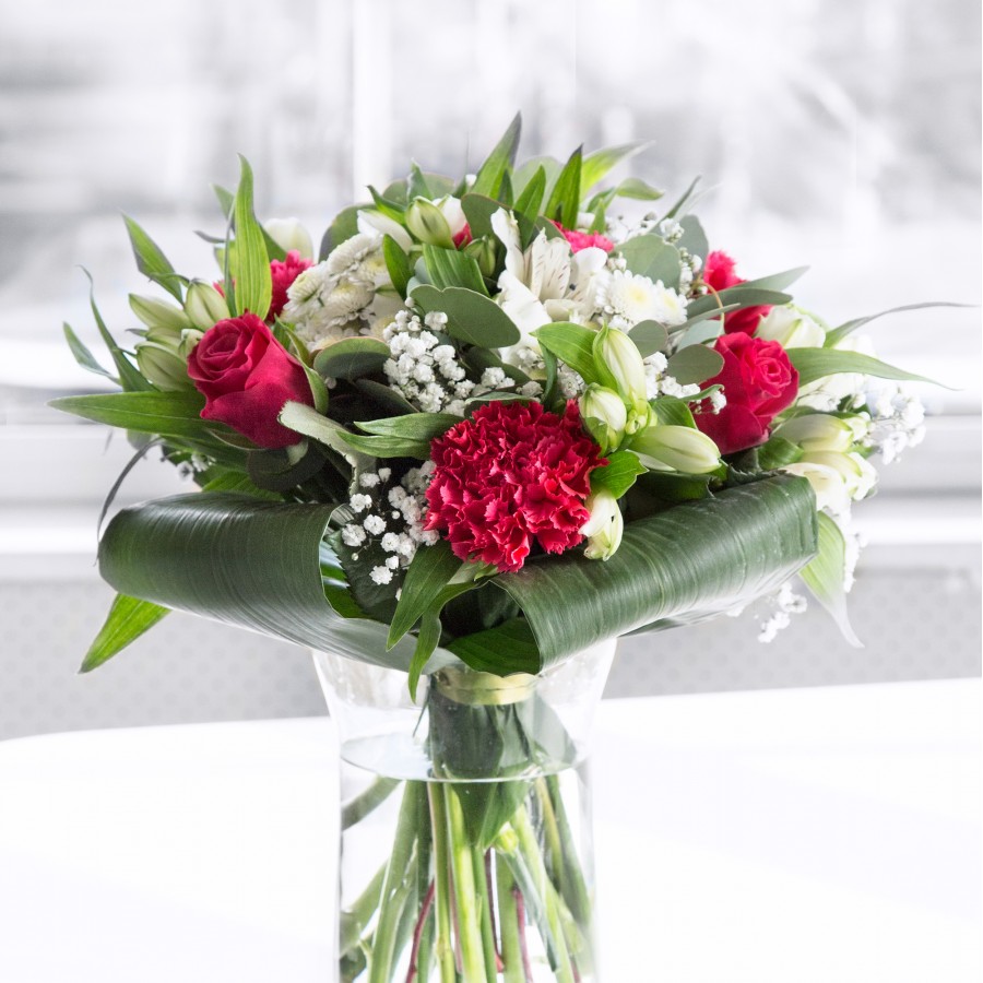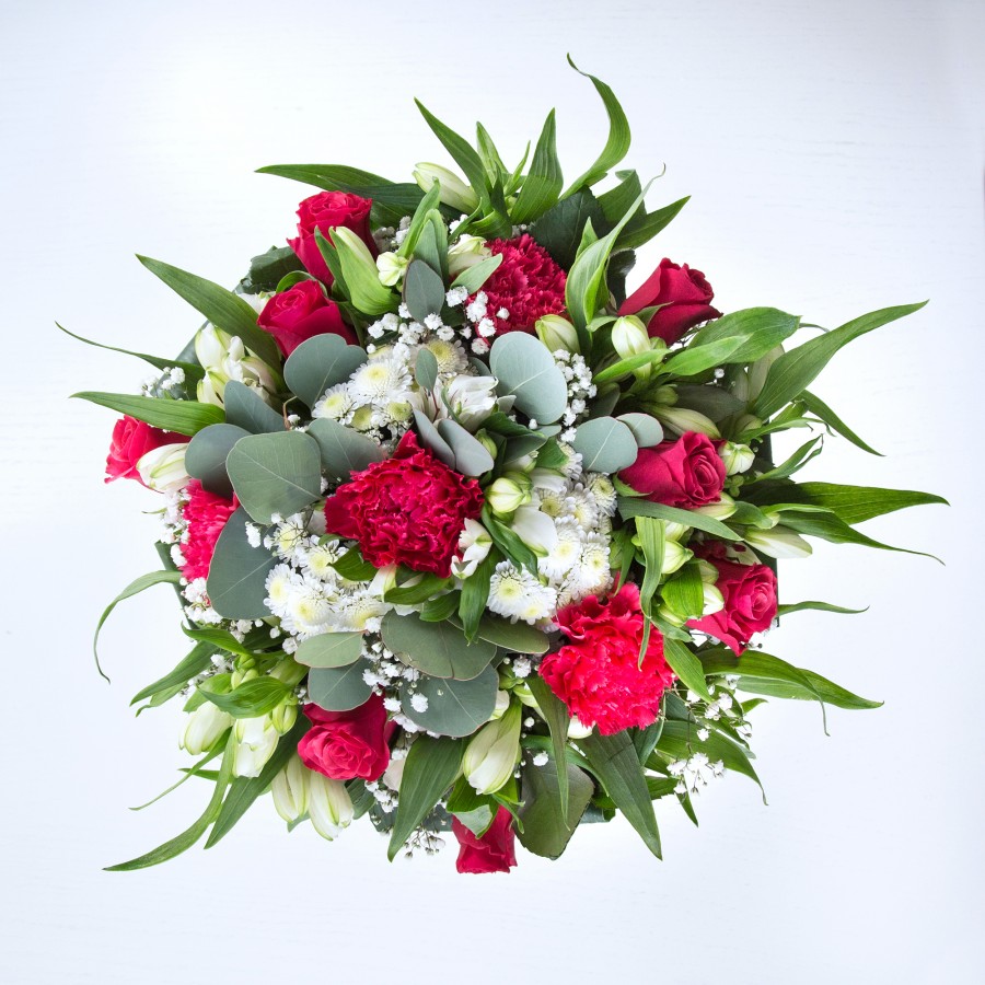 Celebrate lasting moments with our timeless bouquet, expertly arranged with a vibrant assortment of colors and premium blooms. This beautiful arrangement features sweet white chrysanthemums, delicate gypsophila, radiant red roses, and lovely carnations, gracefully combined with white alstroemeria and rich aspidistra leaves.